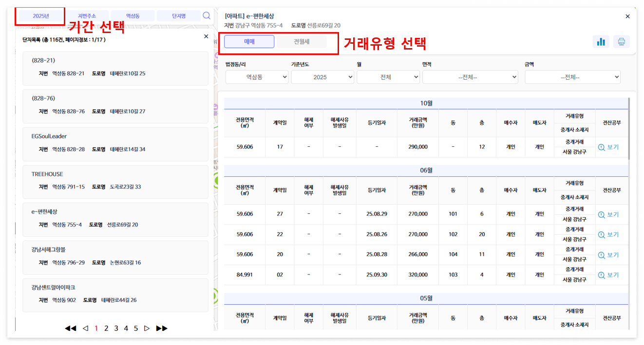 예를 들어, 서울 강남구 역삼동에 위치한 e-편한세상 아파트(지번: 강남구 역삼동 755-4)를 기준으로 2025년 실거래가를 확인해 보면 다음과 같습니다.