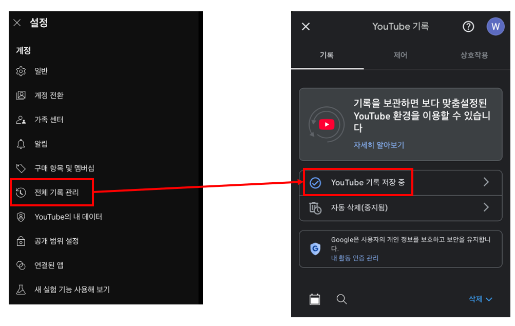 단순히 유튜브 앱 내 설정만으로 부족하다면 구글 계정 전체의 활동을 점검해야 합니다.