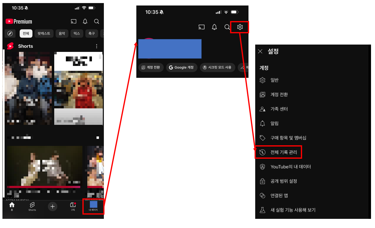 - 방법: 유튜브 앱 실행 → 오른쪽 하단 [나] 아이콘 클릭 → 상단 [설정(톱니바퀴)] → [전체 기록 관리] 접속.