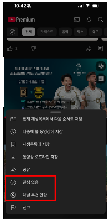 - 방법: 홈 화면의 영상 오른쪽 [점 세 개] 아이콘 클릭 → [관심 없음] 또는 [채널 추천 안 함] 선택.