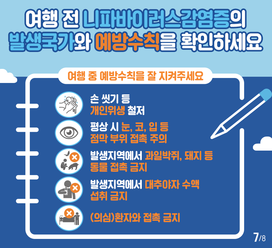 니파 바이러스는 예방이 최선입니다. 발생 지역 여행 시에는 다음 사항을 반드시 준수해야 합니다.