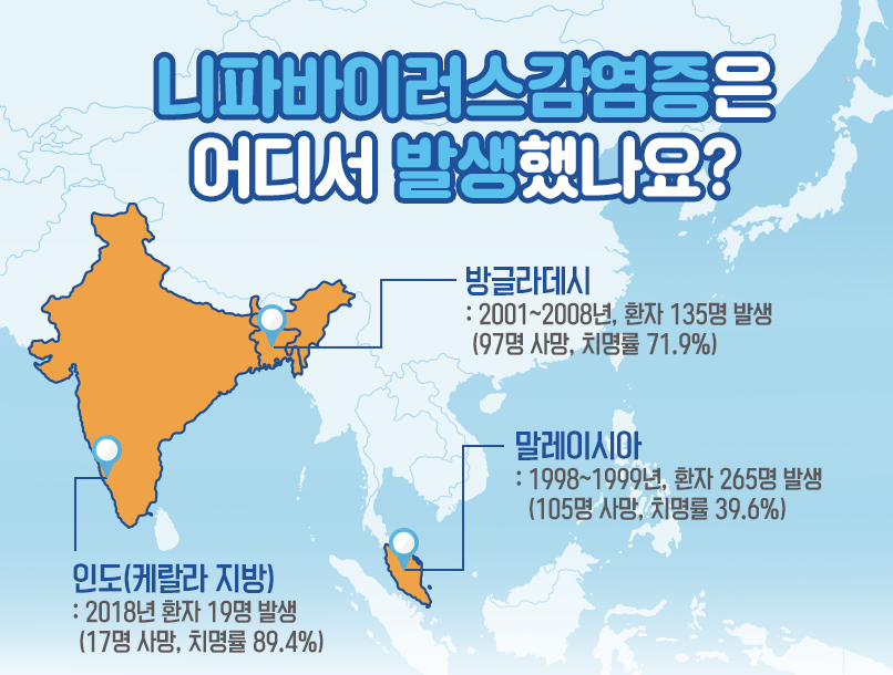 1998년 첫 발견 이후 2024년 5월까지 전 세계에서 총 754명의 감염이 보고됐고, 이 중 435명이 사망했습니다. 현재까지 말레이시아, 싱가포르, 인도, 방글라데시, 필리핀 등 5개국에서만 발생 사례가 보고됐으며, 최근 10년간은 인도와 방글라데시에서 10~20명 내외의 국소적 발병이 이어지고 있습니다.
