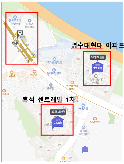 흥미로운 점은 39년 차 명수대 한강이 84㎡ 약 22.9억 원에 거래된다는 사실입니다. 흑석센트레빌1차보다 23년이나 오래됐는데 고작 2억 원 차이밖에 나지 않습니다. 이유는 명수대 한강이 흑석역 접근성과 한강 조망에서 우위를 점하기 때문입니다.