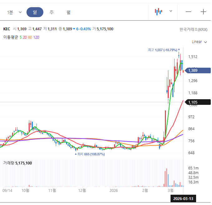2026년 3월 중순 기준, KEC의 주가는 약 1,390원~1,450원 사이에서 강력한 상승 모멘텀을 형성하고 있습니다.