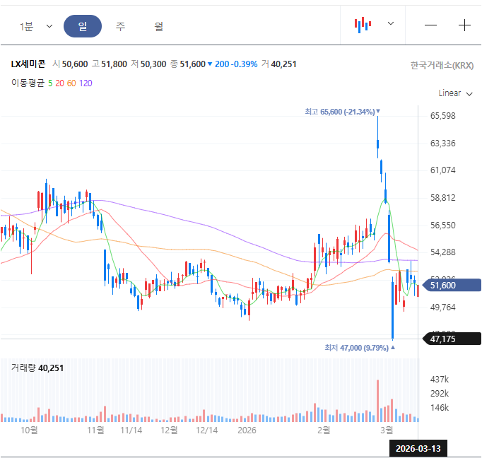2026년 3월 중순 기준, LX세미콘의 주가는 약 51,000원~53,000원대에서 바닥을 다지고 있습니다.